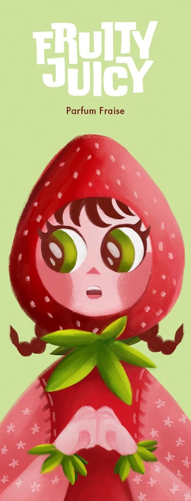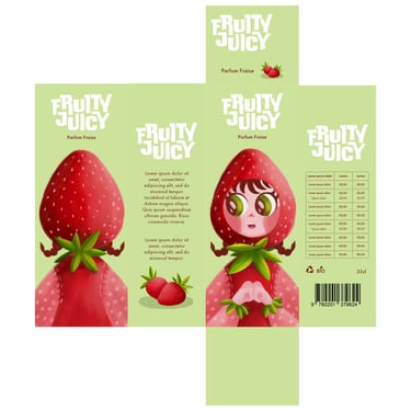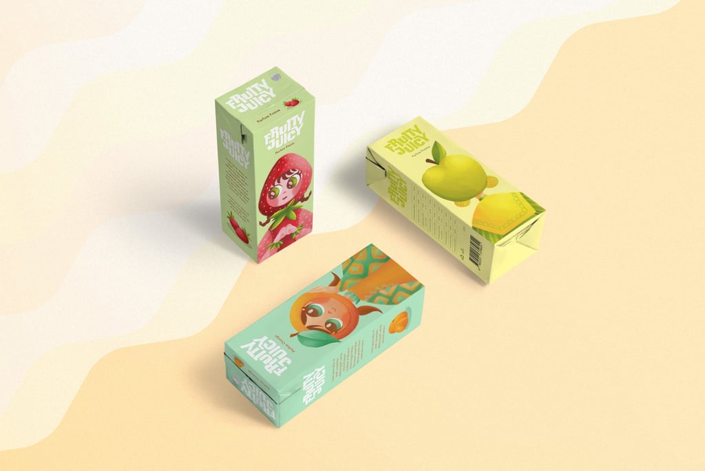 Marque de briques de jus de fruits pour enfants fictive. Chaque saveur est représenté par un petit personnage, mi-humain mi-fruit. Fruity Juicy désire faire découvrir aux enfants, le délicieux goût des fruits bios, au travers d’un jus sans arômes artificiels.