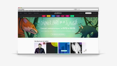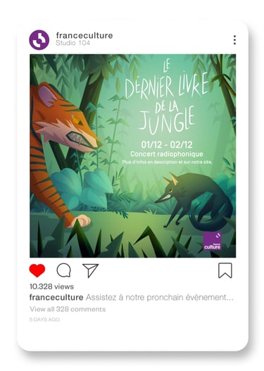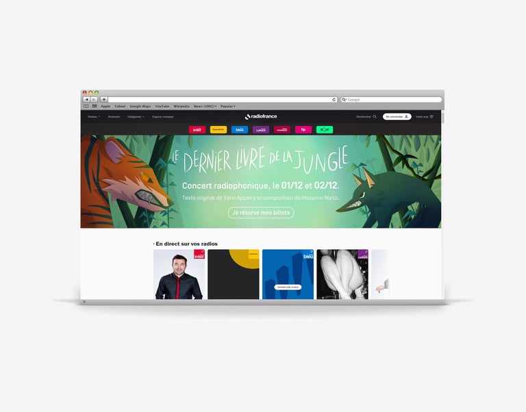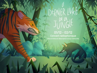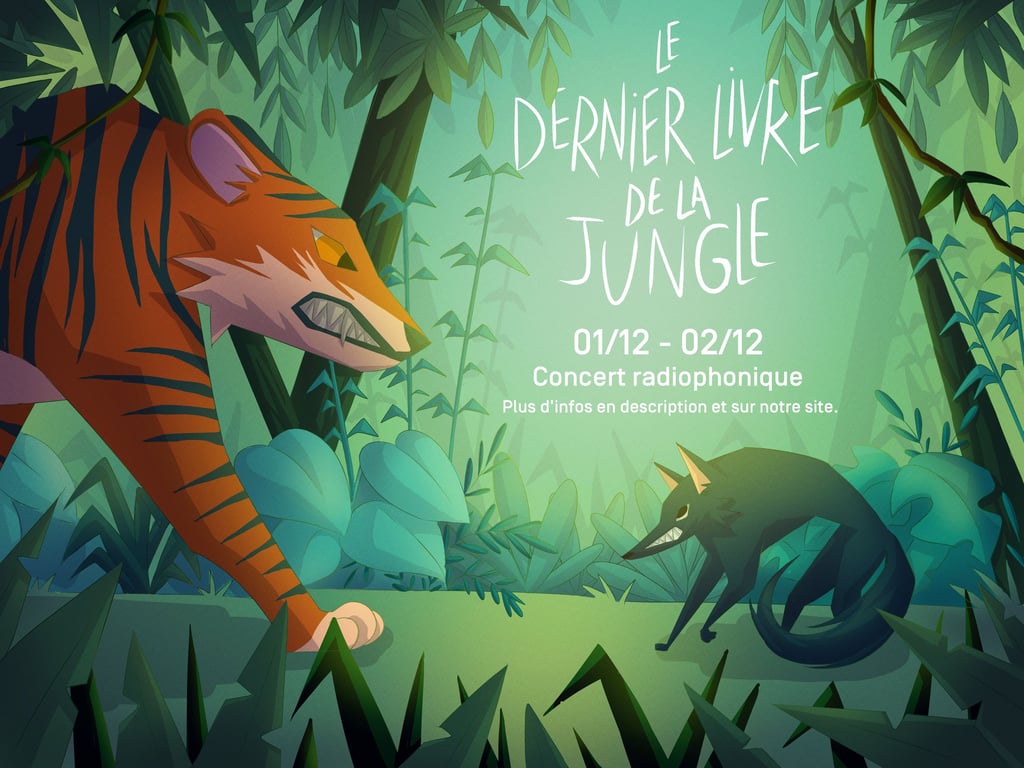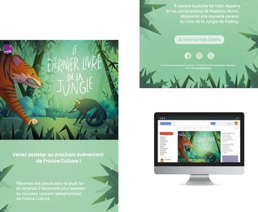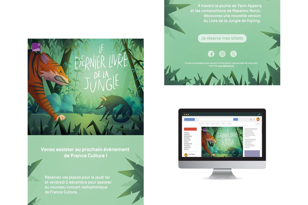 Ensemble de supports de communication pour le concert radiophonique de l’œuvre Le dernier livre de la Jungle, organisé par France Culture.