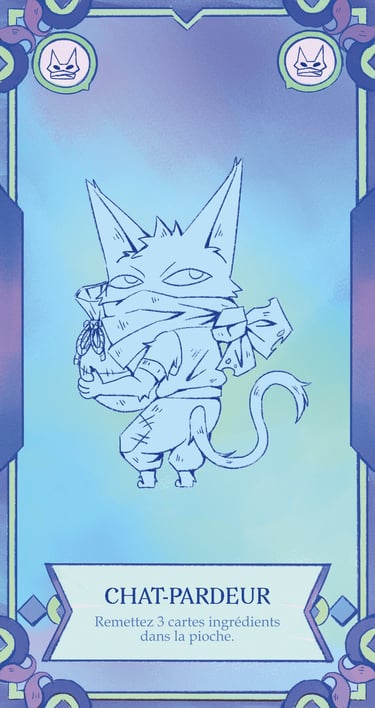 Chaque joueur en possède 3 dans les mains et à chaque tour, une carte doit être posée sur le plateau et une autre piochée. Toutes les cartes ingrédients ont un petit pictogramme qui permet de les identifier plus facilement.